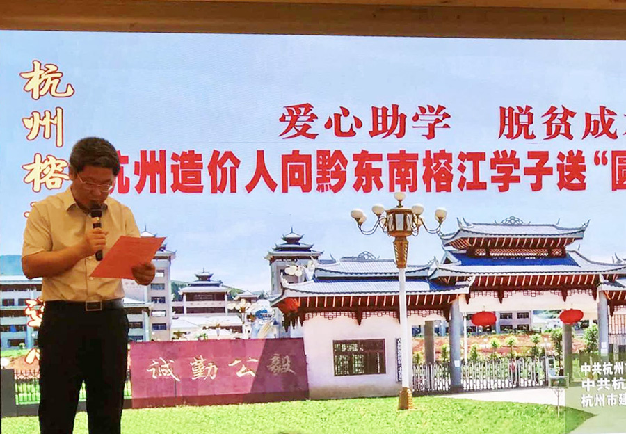 為貫徹落實(shí)日前省委常委、市委書記周江勇率杭州市代表團(tuán)赴貴州省黔東南州榕江縣落實(shí)扶貧協(xié)作工作座談會(huì)精神,杭州市建設(shè)工程造價(jià)行業(yè)唱響“杭州榕江心連心,助力脫貧獻(xiàn)愛心”的主旋律,在“六一兒童節(jié)”到來之際,杭州市建設(shè)工程造價(jià)和投資管理服務(wù)中心黨支部、杭州市建設(shè)工程造價(jià)協(xié)會(huì)黨委、關(guān)工委聯(lián)合牽頭,于2020年5月29日下午開展杭州造價(jià)人向黔東南學(xué)子送600份“圓夢禮包”助學(xué)成才活動(dòng)。市關(guān)工委、市委組織部兩新處、團(tuán)市委、市文明辦、市兩新黨務(wù)工作者協(xié)會(huì)、市社會(huì)組織管理局、省造價(jià)總站、市建委領(lǐng)導(dǎo)及54家企業(yè)代表近百人參加了本次活動(dòng)。